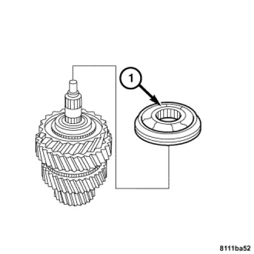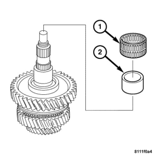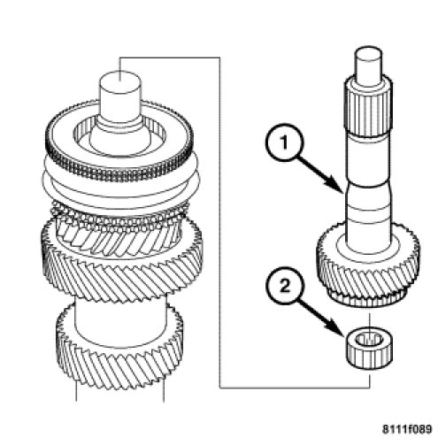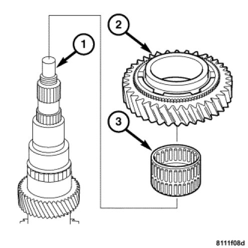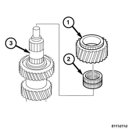 1. Install the 6th gear needle bearing (2) and gear (1) on the mainshaft (3).