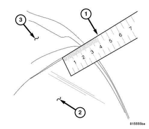 3. Using a ruler (1), measure the distance from the face of the glass (2) to the outer edge of the convertible top (3) with the door latched in the second catch position (closed tight). The face of the window glass must be 10 mm (0.4 in.) from the outer edge of the convertible top.