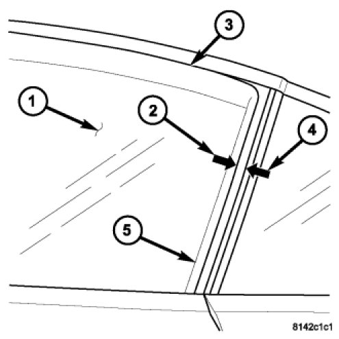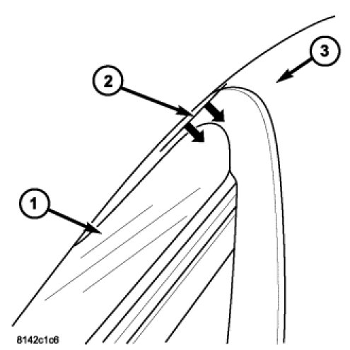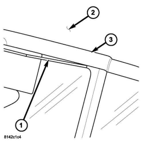 2. Check the window height to the roof weatherstrip (3) when the door is latched in the first catch position. The gap must be between 1-2 mm (.040-.080 in.) (1) from the upper edge of the glass to the roof weatherstrip as shown.