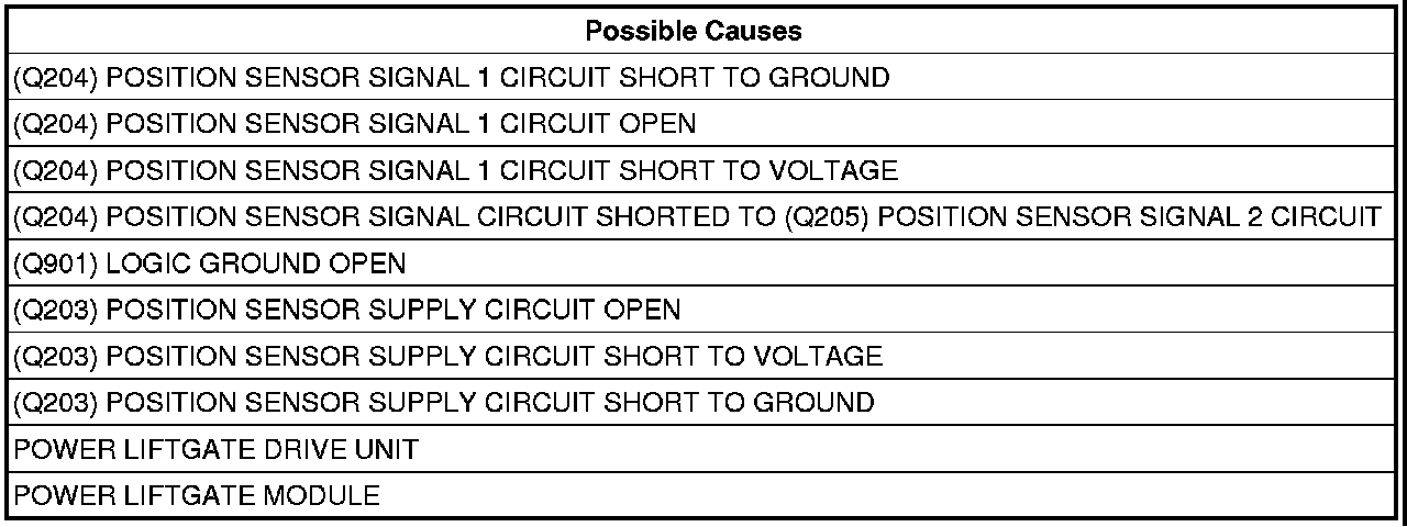 When the Power Liftgate Module senses the (Q204) Position Sensor Signal 1 circuit not pulsing during motor operation, this code will set.