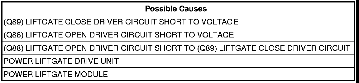 - Repair the (Q88) Liftgate Open Driver circuit for a short to voltage.