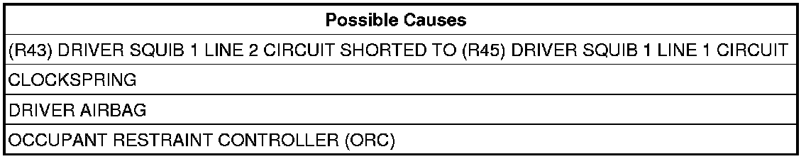 - Repair the (R43) Driver Squib 1 Line 2 circuit for a short to the (R45) Driver Squib 1 Line 1 circuit.