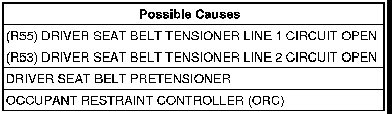With the ignition on, the Occupant Restraint Controller (ORC) monitors the resistance of the Driver Seat Belt Tensioner circuits.