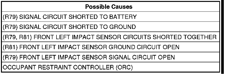 - Repair the (R79) Front Left Impact Sensor Signal circuit for an open or high resistance.
