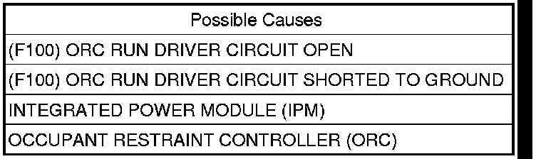- Repair the (F100) ORC Run Driver circuit for a short to ground.