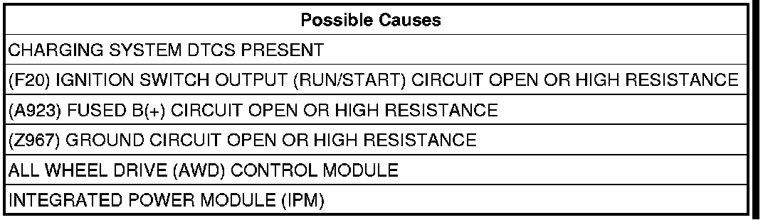 The All Wheel Drive Control Module detects that system voltage is below 8.0 volts for 10 seconds.