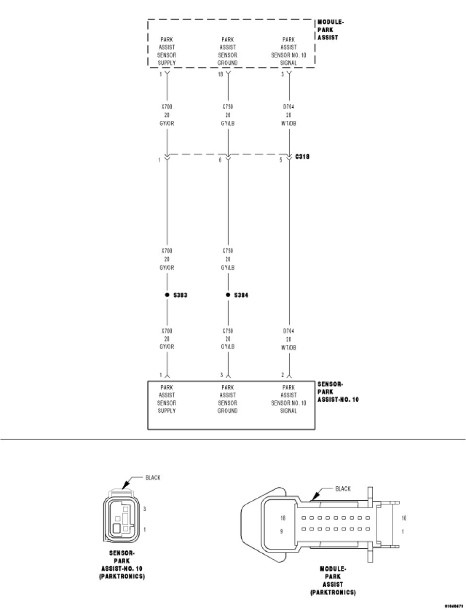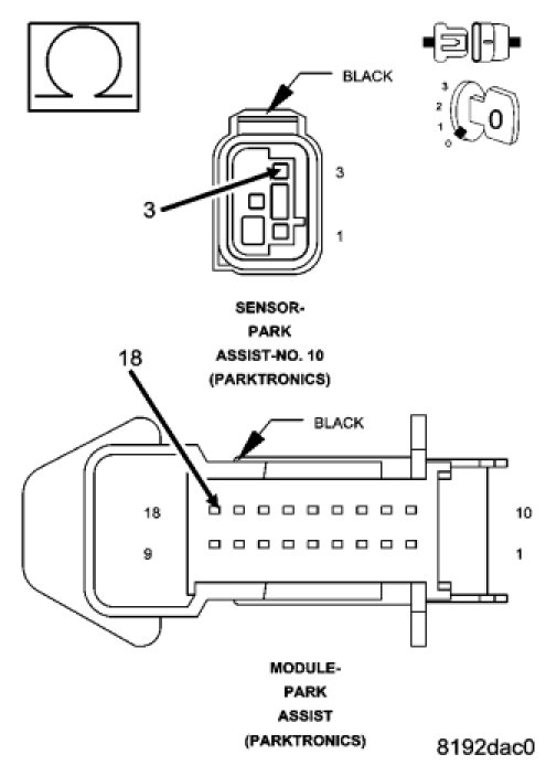 NOTE: The numbering system for the park assist sensors allows for up to ten sensors on the vehicle, six front and four rear. The sensors are numbered in a clockwise manner starting at the left front bumper. The left front sensor (if equipped with front park assist) is the number 1 sensor. The numbering continues in a clockwise direction around the vehicle, so the left rear sensor is the number 10 sensor.