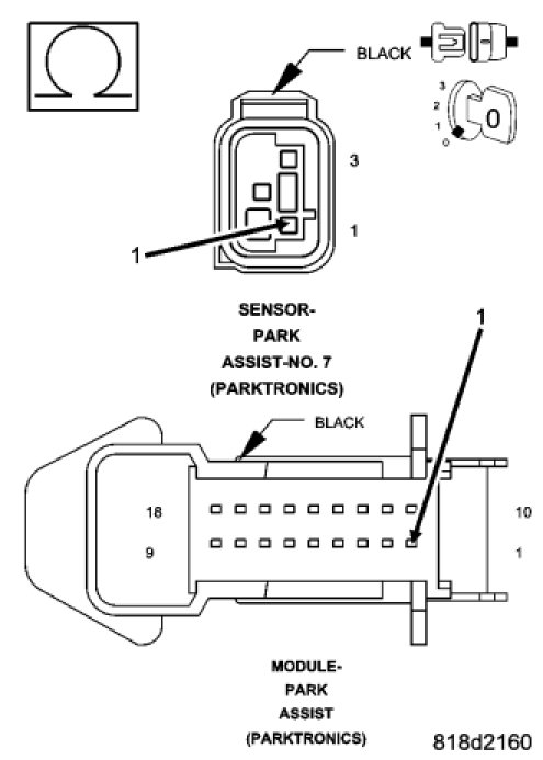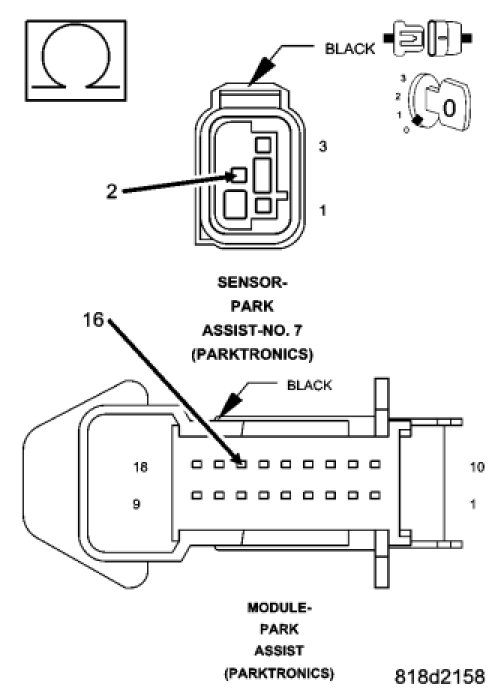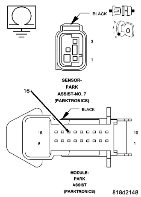 NOTE: The numbering system for the park assist sensors allows for up to ten sensors on the vehicle, six front and four rear. The sensors are numbered in a clockwise manner starting at the left front bumper. The left front sensor (if equipped with front park assist) is the number 1 sensor. The numbering continues in a clockwise direction around the vehicle, so the left rear sensor is the number 10 sensor.