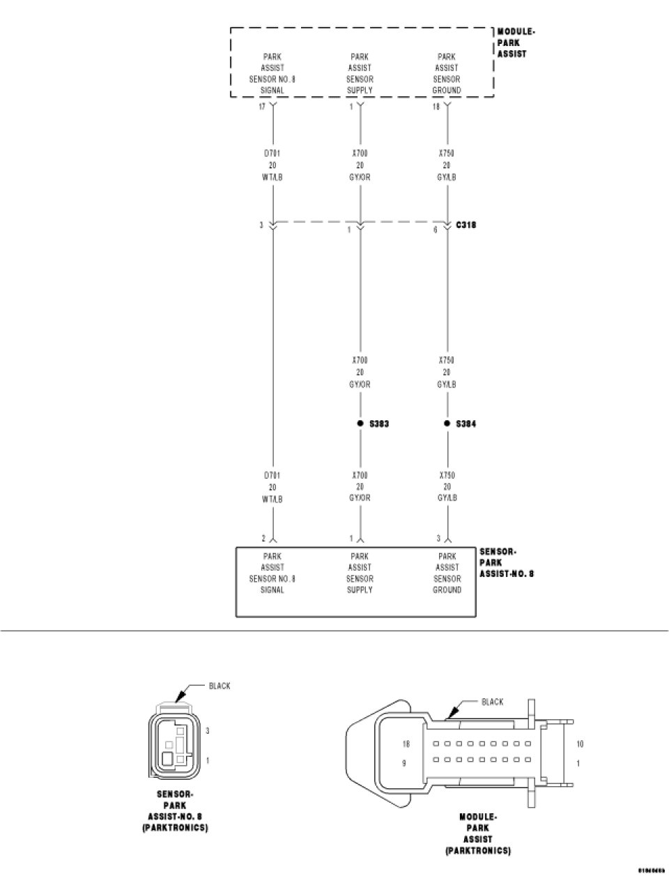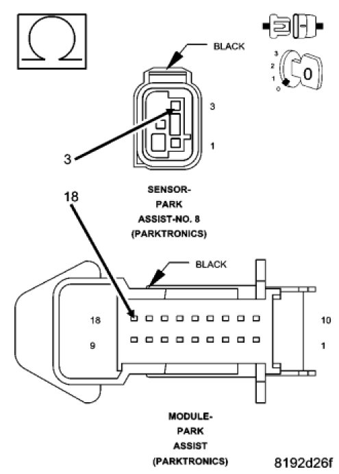 NOTE: The numbering system for the park assist sensors allows for up to ten sensors on the vehicle, six front and four rear. The sensors are numbered in a clockwise manner starting at the left front bumper. The left front sensor (if equipped with front park assist) is the number 1 sensor. The numbering continues in a clockwise direction around the vehicle, so the left rear sensor is the number 10 sensor.