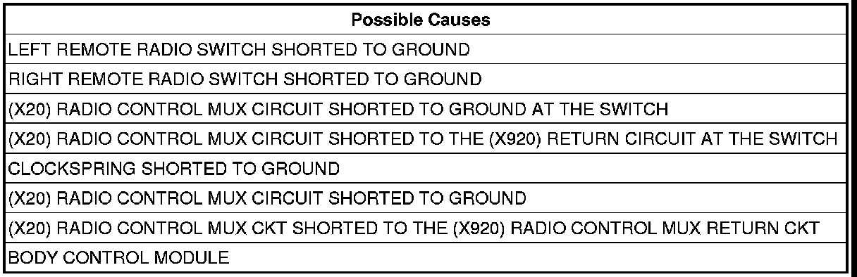 - Repair the (X20) Radio Control MUX circuit for a short to the Radio Control MUX Return circuit between the clockspring and the remote radio switches.