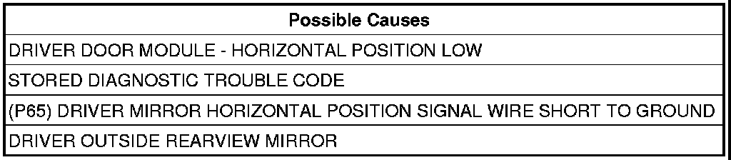 - Repair the (P65) Driver Mirror Horizontal Position Signal wire for a short to ground.