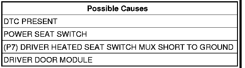 - Repair the (P7) Driver Heated Seat Switch MUX circuit for a short to ground.