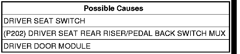- Repair the (P202) Driver Seat Rear Riser/Pedal Back Switch MUX circuit as necessary.