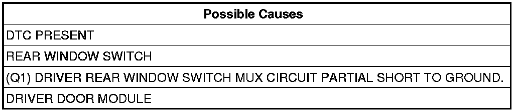 3. (Q1) DRIVER REAR WINDOW SWITCH MUX CIRCUIT PARTIAL SHORT TO GROUND.