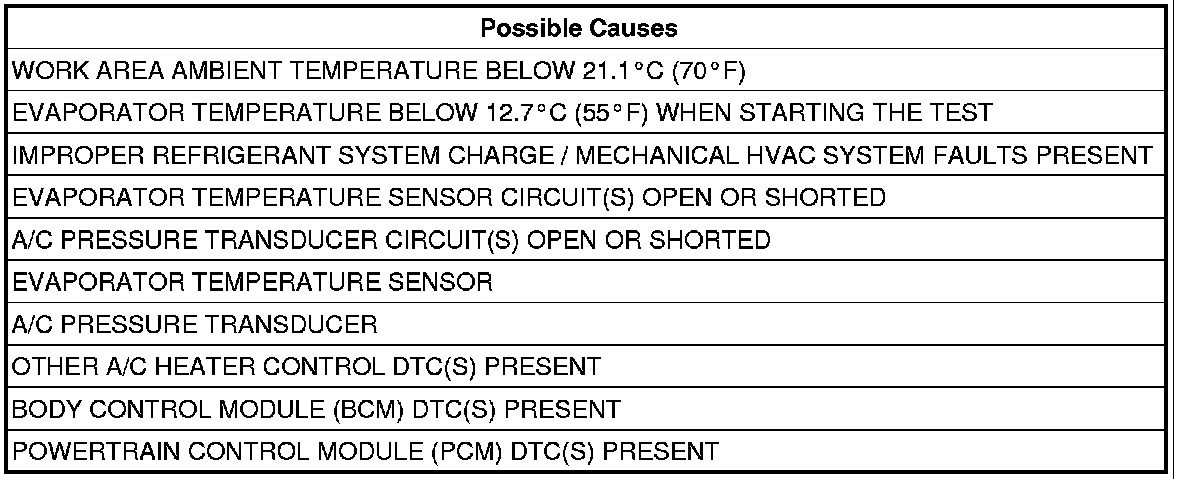 If the A/C system is unable to lower Evaporator temperature 11.11°C (20°F) within two minutes.