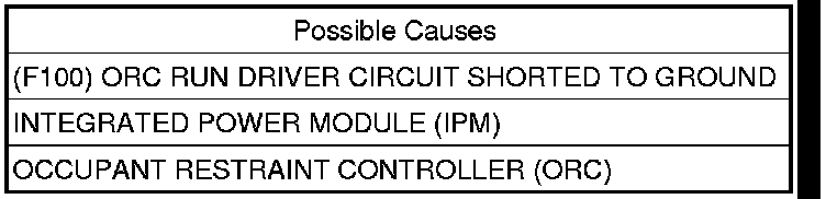- Repair the (F100) ORC Run Driver circuit for a short to ground.