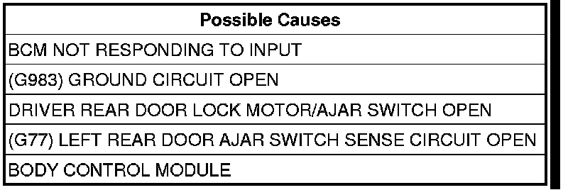 - Repair the (G77) Left Rear Door Ajar Switch Sense circuit for an open.