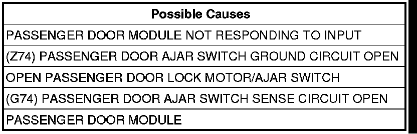 - Repair the (G74) Passenger Door Ajar Switch Sense circuit for an open.