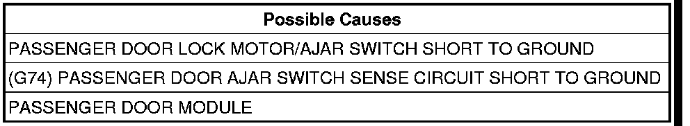 - Repair the (G74) Passenger Door Ajar Switch Sense circuit for a short to ground.
