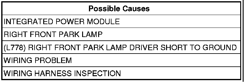 - Repair the (L778) Right Front Park Lamp Driver circuit for a short to ground.