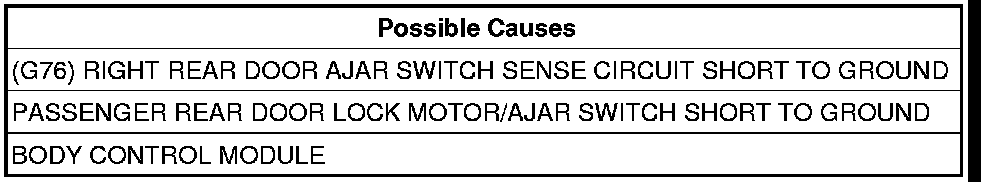- Repair the (G76) Right Rear Door Ajar Switch Sense circuit for a short to ground.