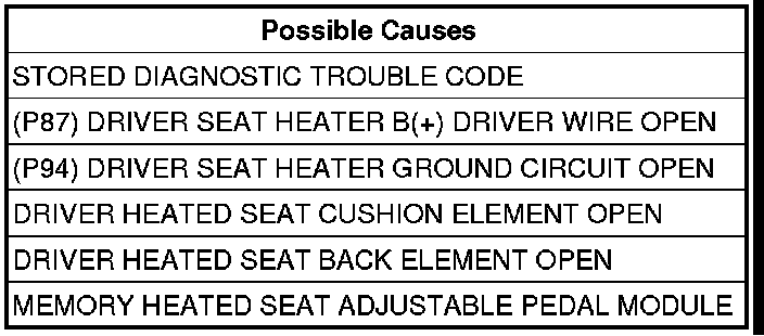 - Repair the (P94) Driver Seat Heater Ground circuit for an open.