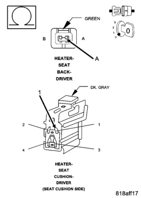 Measure the resistance of the SEAT CUSHION HEATER ELEMENT by connecting one lead to the Driver Seat Heater B(+) Driver terminal and the other lead to the Driver Seat Heater Ground in the Heated Seat Cushion 4-way connector (seat side).