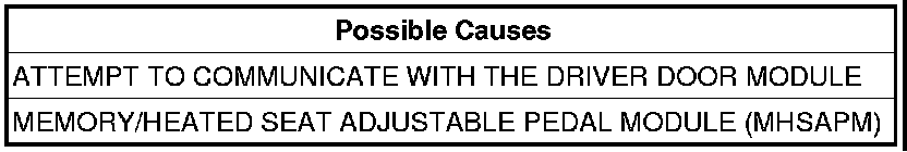 The module does not receive any messages from the DDM. Time to mature for the Memory/Heated Seat Adjustable Pedal Module (MHSAPM) 5 seconds.