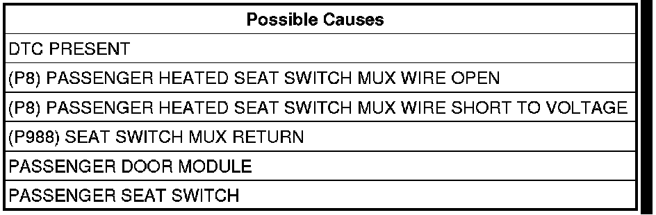 - Repair the (P8) Passenger Seat Switch MUX circuit for a short to voltage.