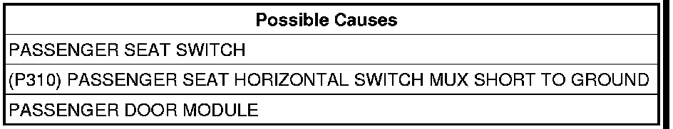 - Repair the (P310) Passenger Seat Horizontal Switch MUX circuit for a short to ground.