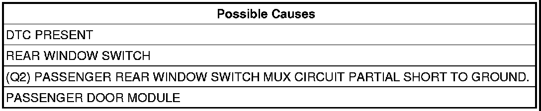 3. (Q2) PASSENGER REAR WINDOW SWITCH MUX CIRCUIT PARTIAL SHORT TO GROUND.