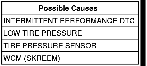 NOTE: If the tire pressure was out of specification and by adjusting the pressure corrected the DTC, the test is complete. If the tire pressure was within specification and were unable to reset the DTC an intermittent condition is present and the below steps may aid in identifying the failure.