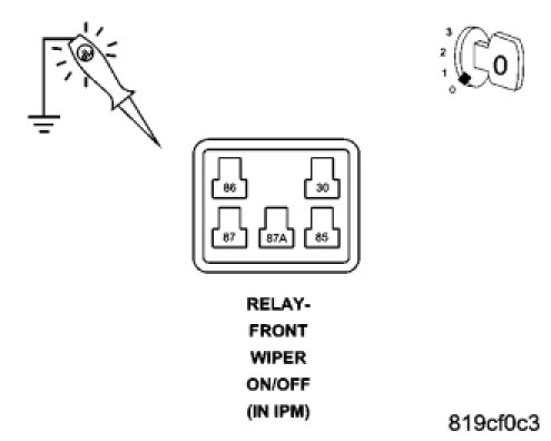 Connect a jumper wire between the Wiper On/Off Relay Control circuit at the IPM connector to ground.