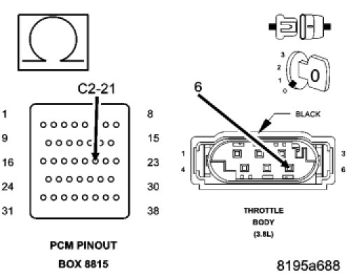 Using the wiring diagram/schematic as a guide, inspect the wiring and connectors between the Throttle Body and the Powertrain Control Module (PCM).