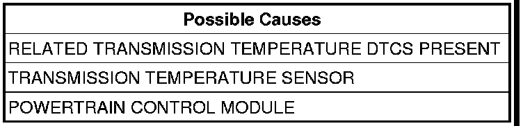 DTC will set when the transmission temperature does not reach a normal operating temperature within a given time frame. Time is variable due to ambient temperature. Approximate DTC set time is 10 to 35 minutes. The following are starting temperature to warm up times to set this DTC: starting temperature -40° C (-40° F) warm up time 35 minutes, starting temperature -28° C ( -20° F) 25 minutes, starting temperature -6.6° C (20° F) 20 minutes, starting temperature 15.5° C (60° F) 10 minutes. When the fault is set, calculated temperature is substituted for measured temperature, however the DTC is stored only after three consecutive occurrences.