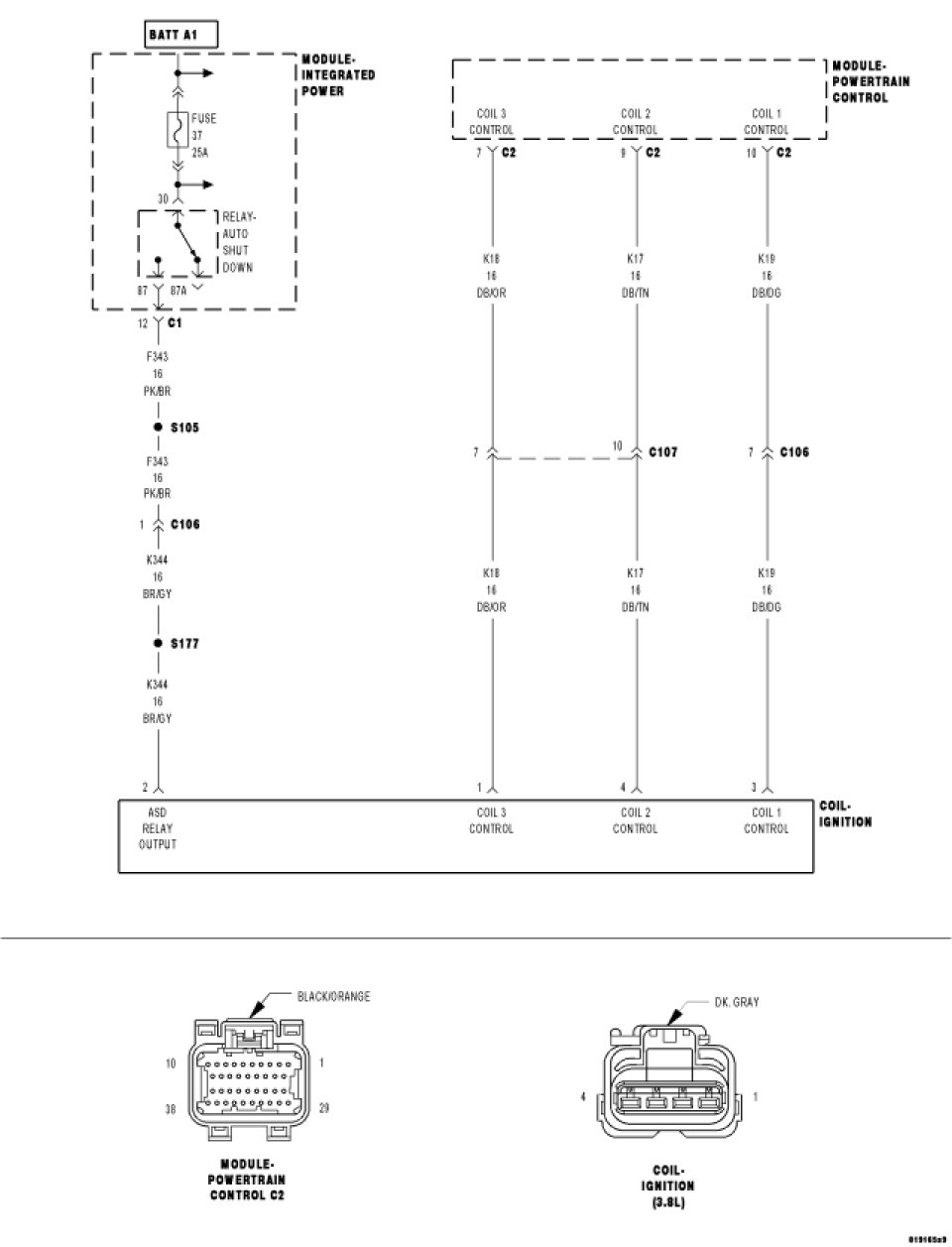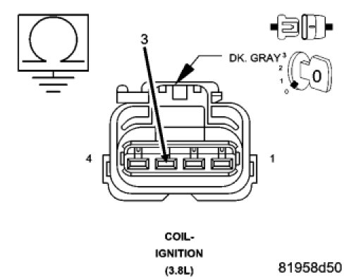 Using a 12 volt test light connected to ground, check the (K344) ASD Relay Output circuit in the Ignition Coil harness connector.