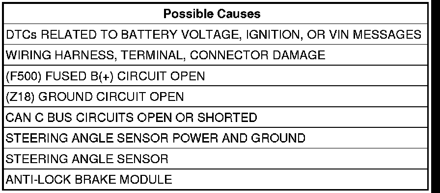If the Anti-Lock Brakes Module fails to receive bus messages from the Steering Angle Sensor for approximately 500 ms.
