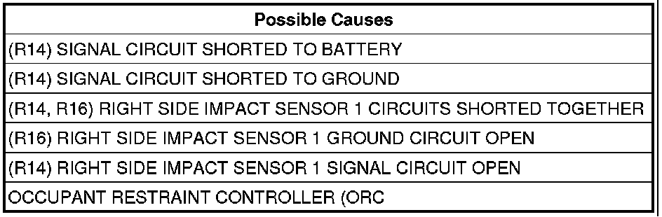 - Repair the (R14) Right Side Impact Sensor 1 Signal circuit for an open or high resistance.