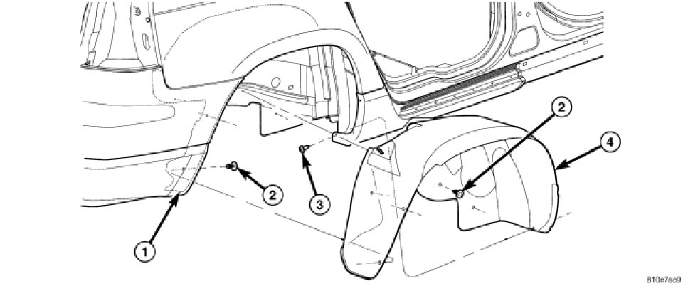 4. Install screw attaching rear wheelhouse splash shield to cladding.
