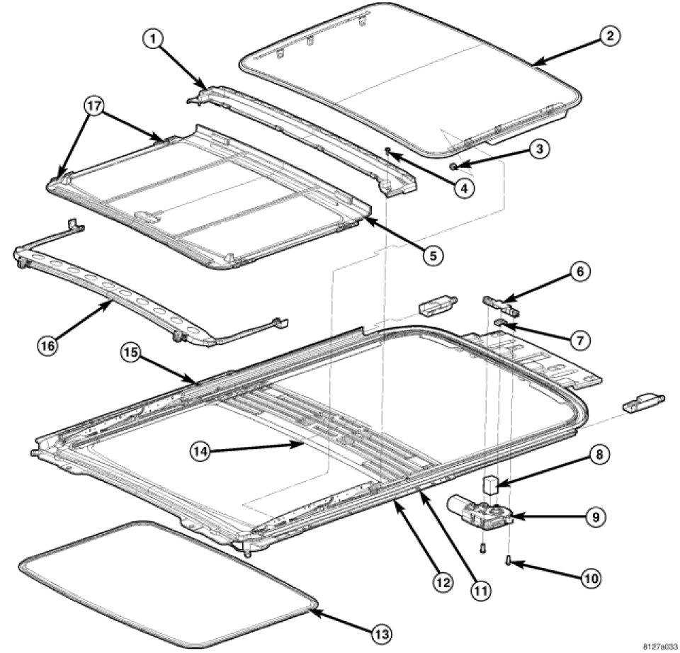 4. Once the original trim lace is attached to sunroof module using a Trim Stick C-4755 or equivalent, begin tucking the headliner under the lip on the trim lace working all the way around the opening. When installing a new trim lace, begin tucking the headliner under the lip as the tear cord is removed working all the way around the opening.