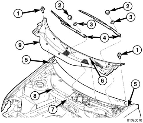 4. Install the two (2) push pin fasteners securing cowl plenum grille to top cowl plenum panel.