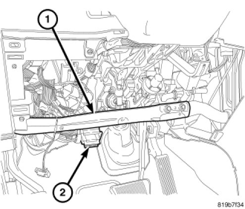 11. Install datalink connector (2) in bracket on instrument panel lower left reinforcement (1).