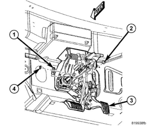 6. Slide booster push rod (1) onto brake pedal pin. Install NEW retaining clip (4) securing push rod to brake pedal.