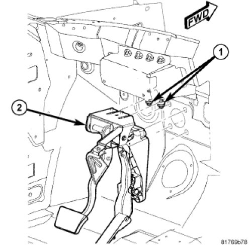 2. Install pedals assembly (2) under instrument panel and slide onto upper mounting studs with mounting nuts (1) loosely installed on upper dash panel bracket and over power brake booster studs. Place it flush up against dash panel. Do not tighten nuts at this time.
