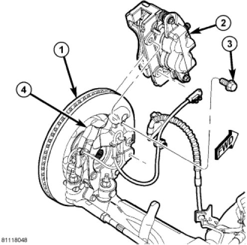 3. Remove two bolts (3) securing disc brake caliper adapter (with brake caliper) (2) to knuckle (4).