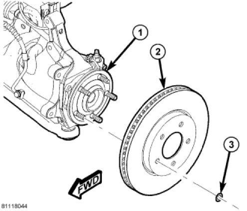 5. Remove any clips (3) retaining brake rotor (2) to wheel studs.