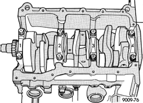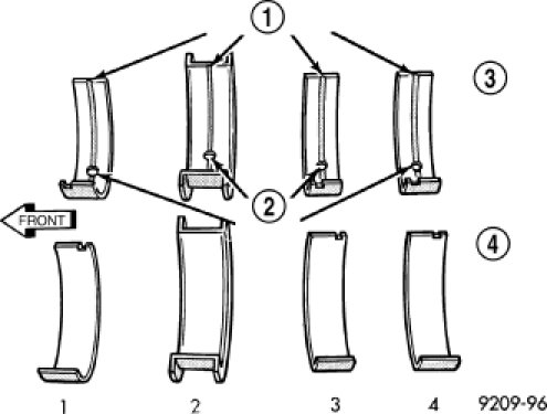 Bearing caps (1,2,3,4) are not interchangeable and should be marked at removal to insure correct assembly. Upper and lower bearing halves are NOT interchangeable. Lower main bearing halves of 1, 3 and 4 are interchangeable. Upper main bearing halves of 1, 3 and 4 are interchangeable.