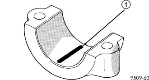 4. Place a piece of Plastigage (1) across the entire width of the bearing shell in the cap approximately 6.35 mm (1/4 in.) off center and away from the oil holes. (In addition, suspected areas can be checked by placing the Plastigage in the suspected area). Torque the bearing cap bolts of the bearing being checked to the proper specifications.