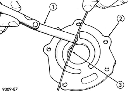 2. Lay a straightedge across the pump cover surface. If a 0.025 mm (0.001 in.) feeler gauge can be inserted between cover and straight edge, cover should be replaced.
