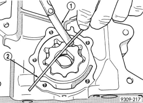 7. Place a straightedge across the face of the chain case cover, between bolt holes. If a feeler gauge of 0.10 mm (0.004 in.) or more can be inserted between rotors and the straightedge, replace pump assembly. ONLY if rotors are in specs.